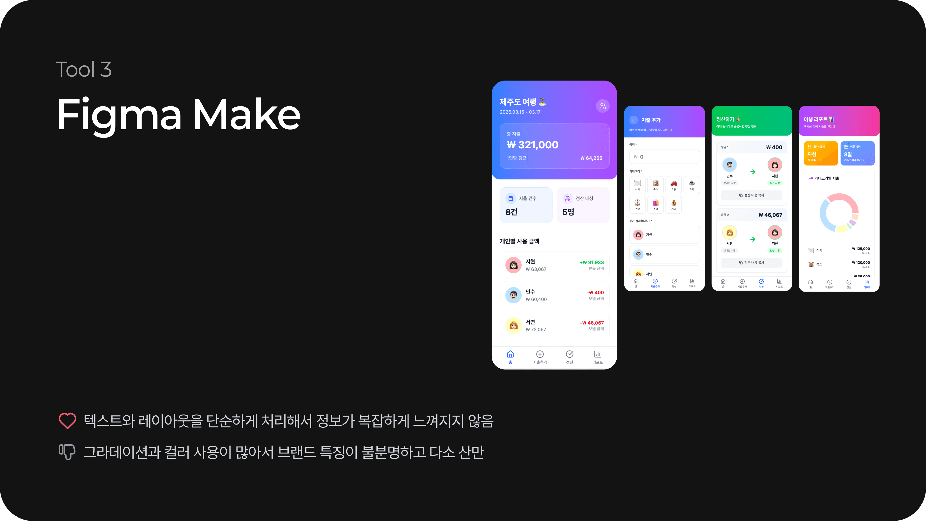 Figma Make는 텍스트와 레이아웃을 단순하게 처리해서 정보가 복잡하게 느겨지지 않았어요.
