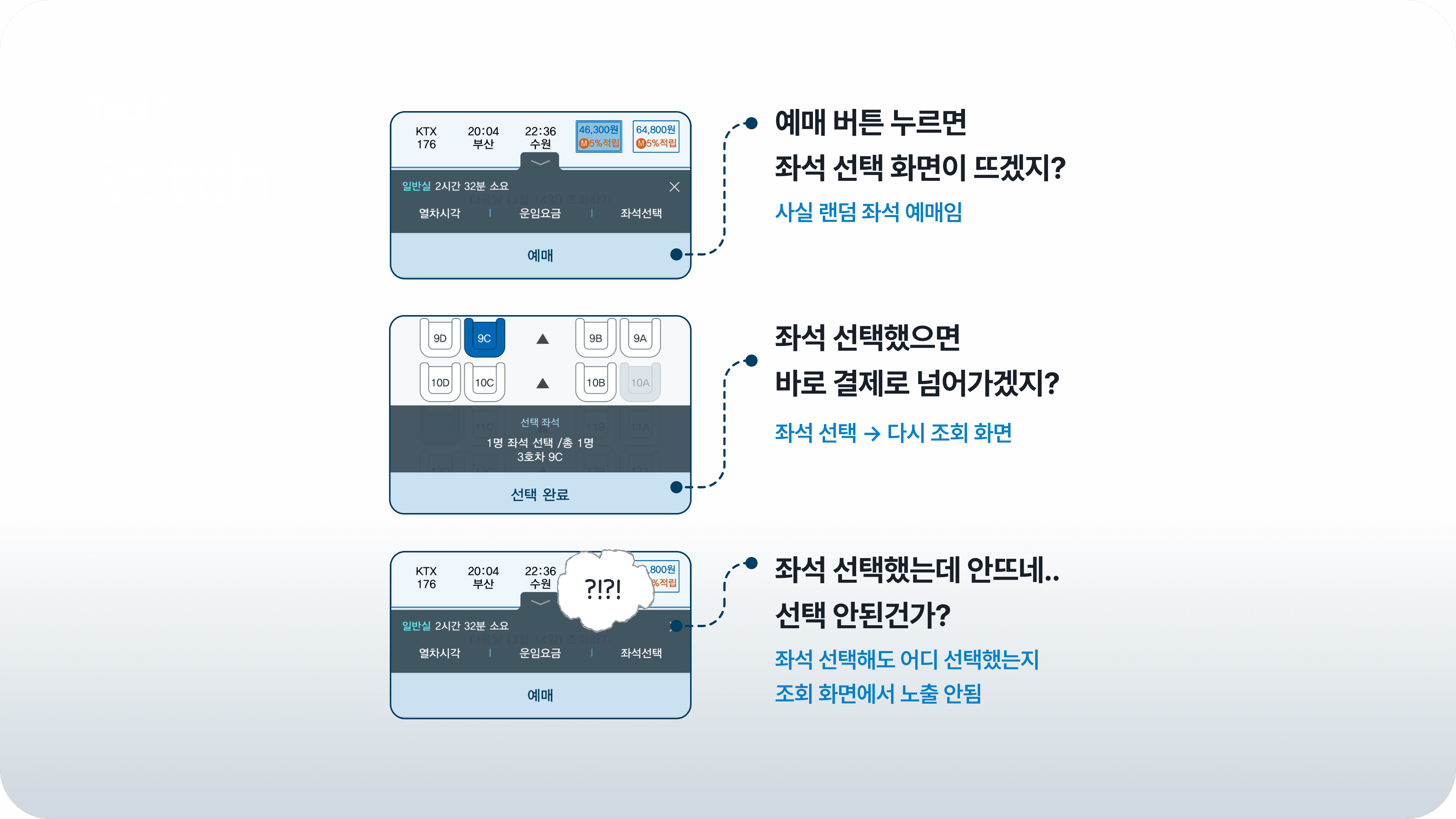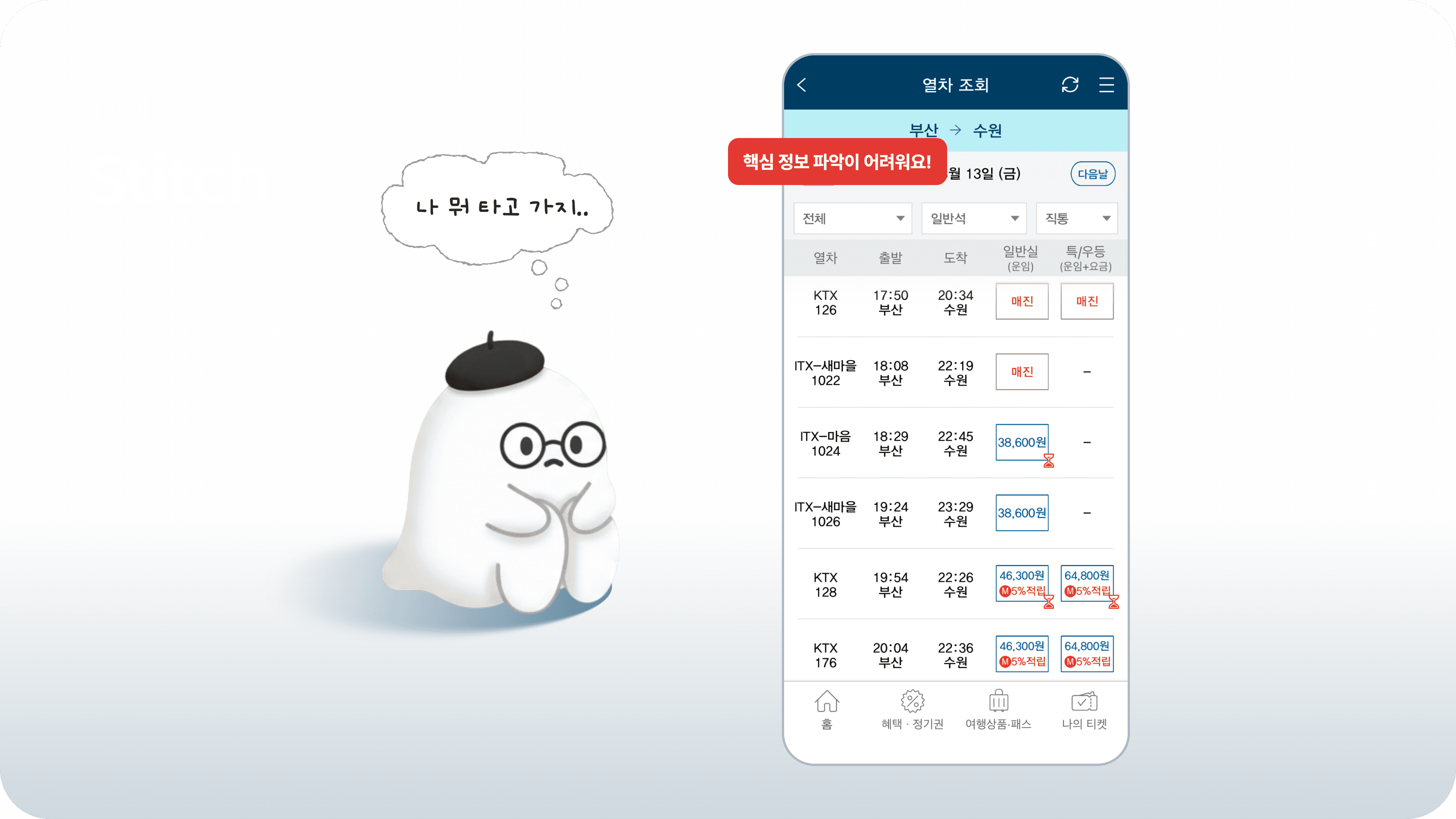 사용자는 보통 내가 원하는 시간대의 열차가 있는지, 좌석이 남아 있는지, 가격이 어떤지 같은 핵심 정보부터 빠르게 파악하고 싶어 해요.