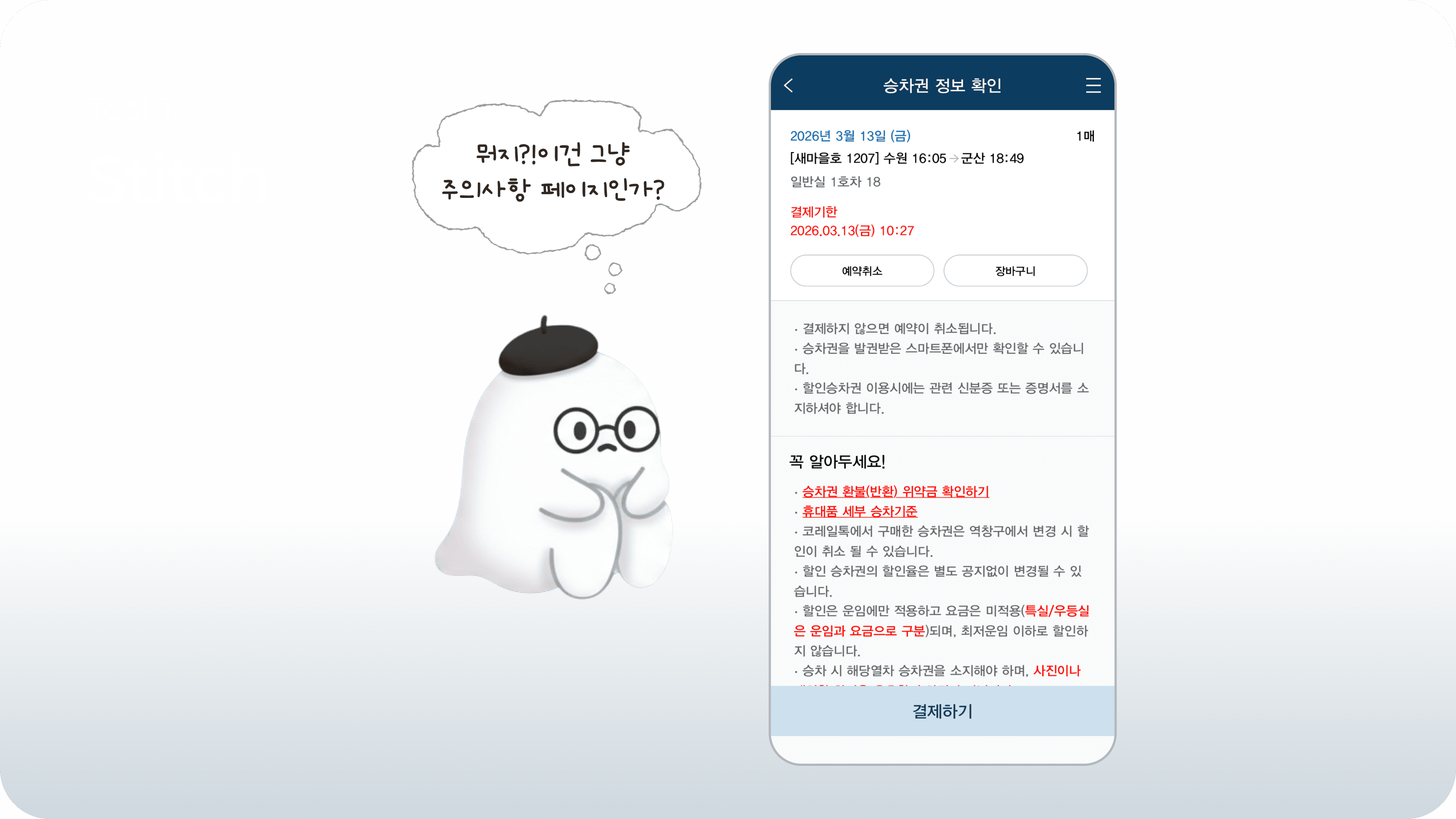 내가 선택한 열차 정보가 맞는지, 날짜와 시간은 정확한지, 좌석은 원하는 조건인지, 취소나 환불 관련 안내는 무엇인지 빠르게 확인할 수 있어야 해요.