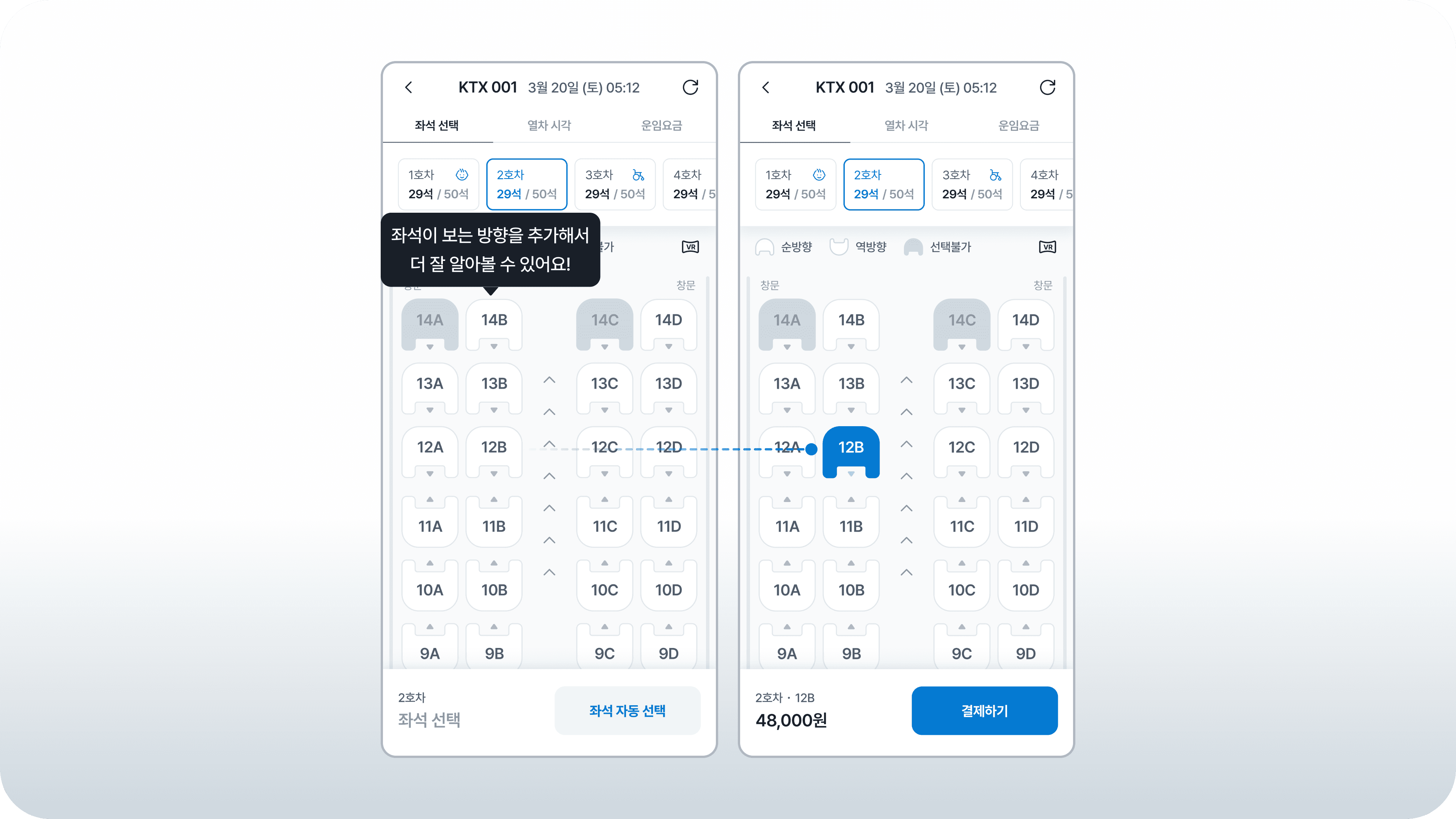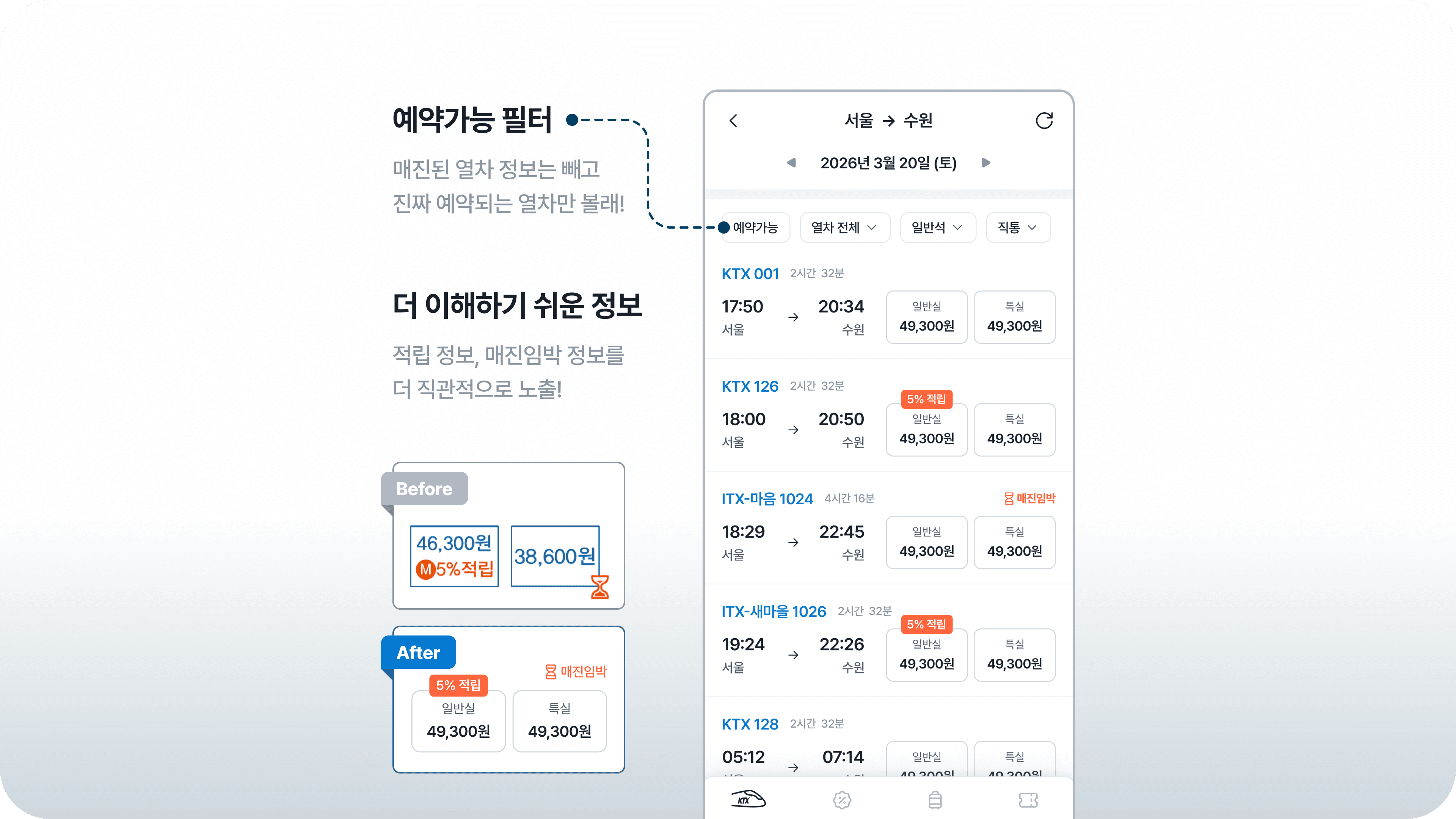 사용자는 더 적은 피로로 열차를 비교할 수 있고, 어떤 열차를 선택할지 훨씬 빠르게 판단할 수 있어요.