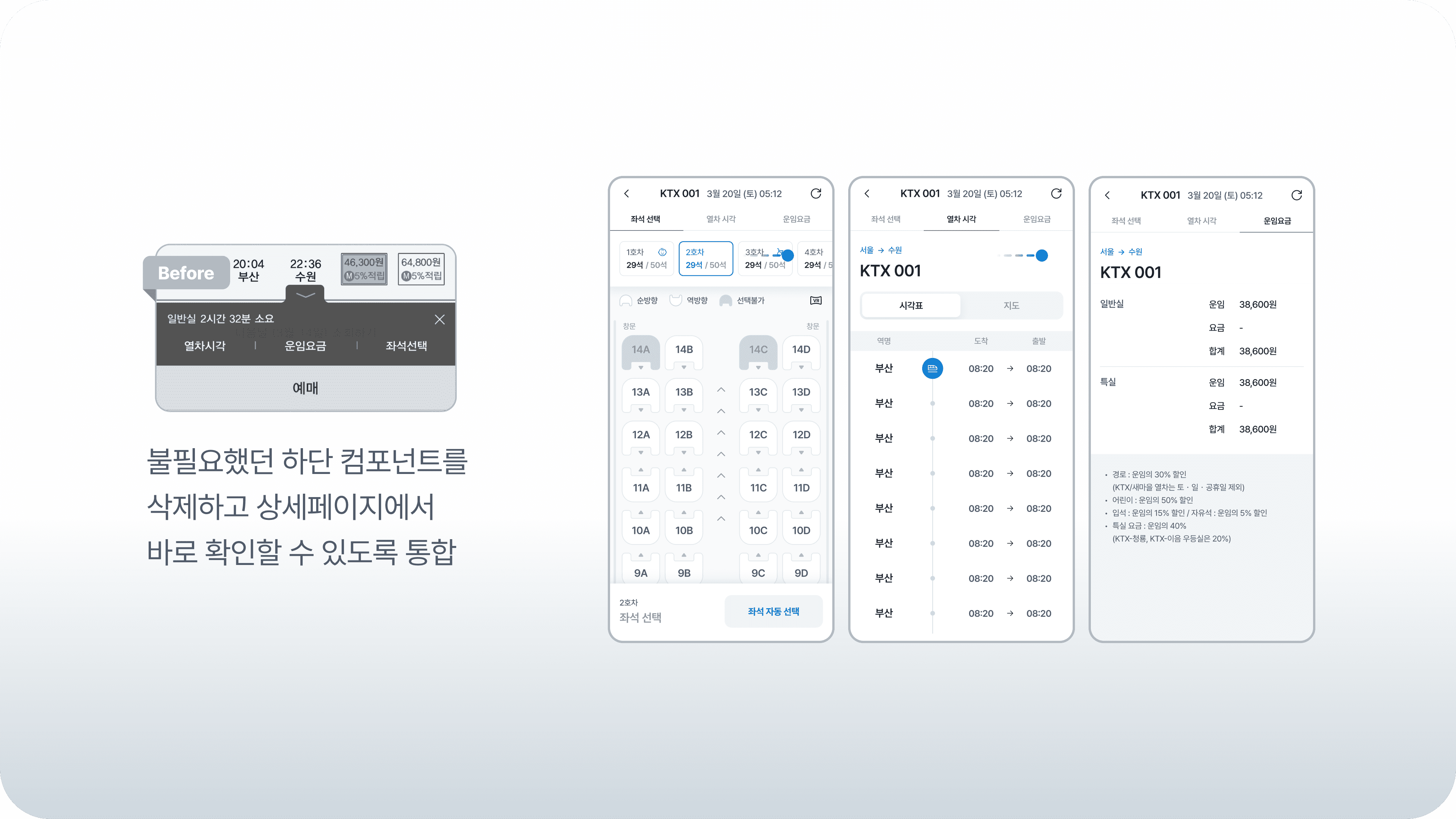 하단에서 한 번 더 거쳐야 했던 구조를 덜어내고, 상세 페이지 안에서 좌석 선택, 열차 시각, 운임 요금을 바로 확인할 수 있게 구성했어요.