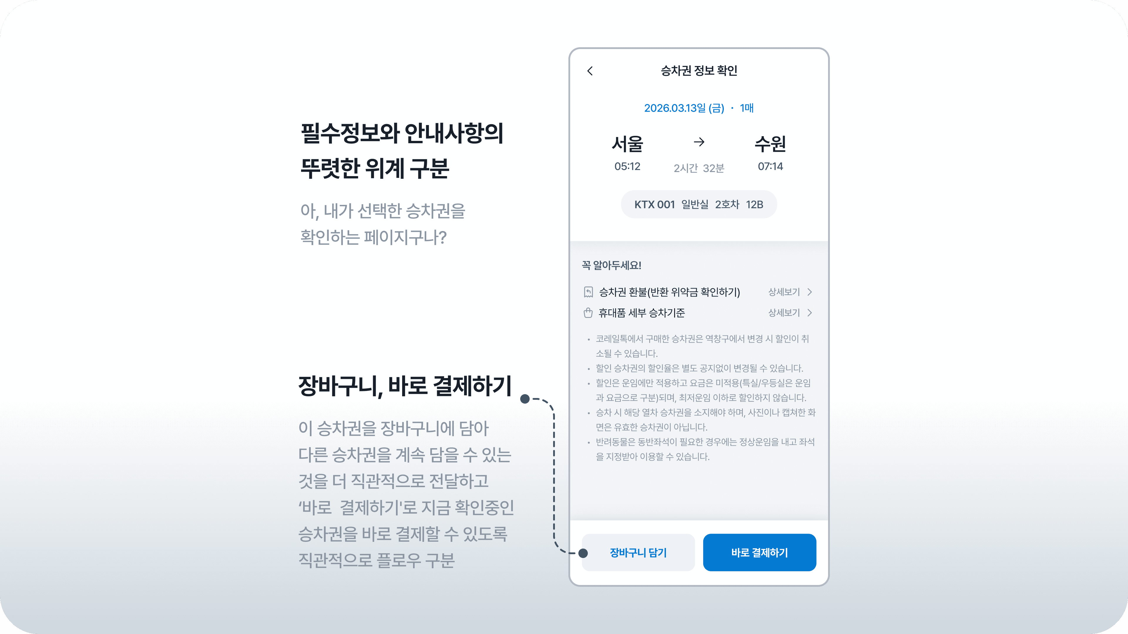 내가 선택한 열차 정보가 맞는지, 날짜와 시간은 정확한지, 좌석은 원하는 조건인지, 취소나 환불 관련 안내는 무엇인지 빠르게 확인할 수 있어야 해요.