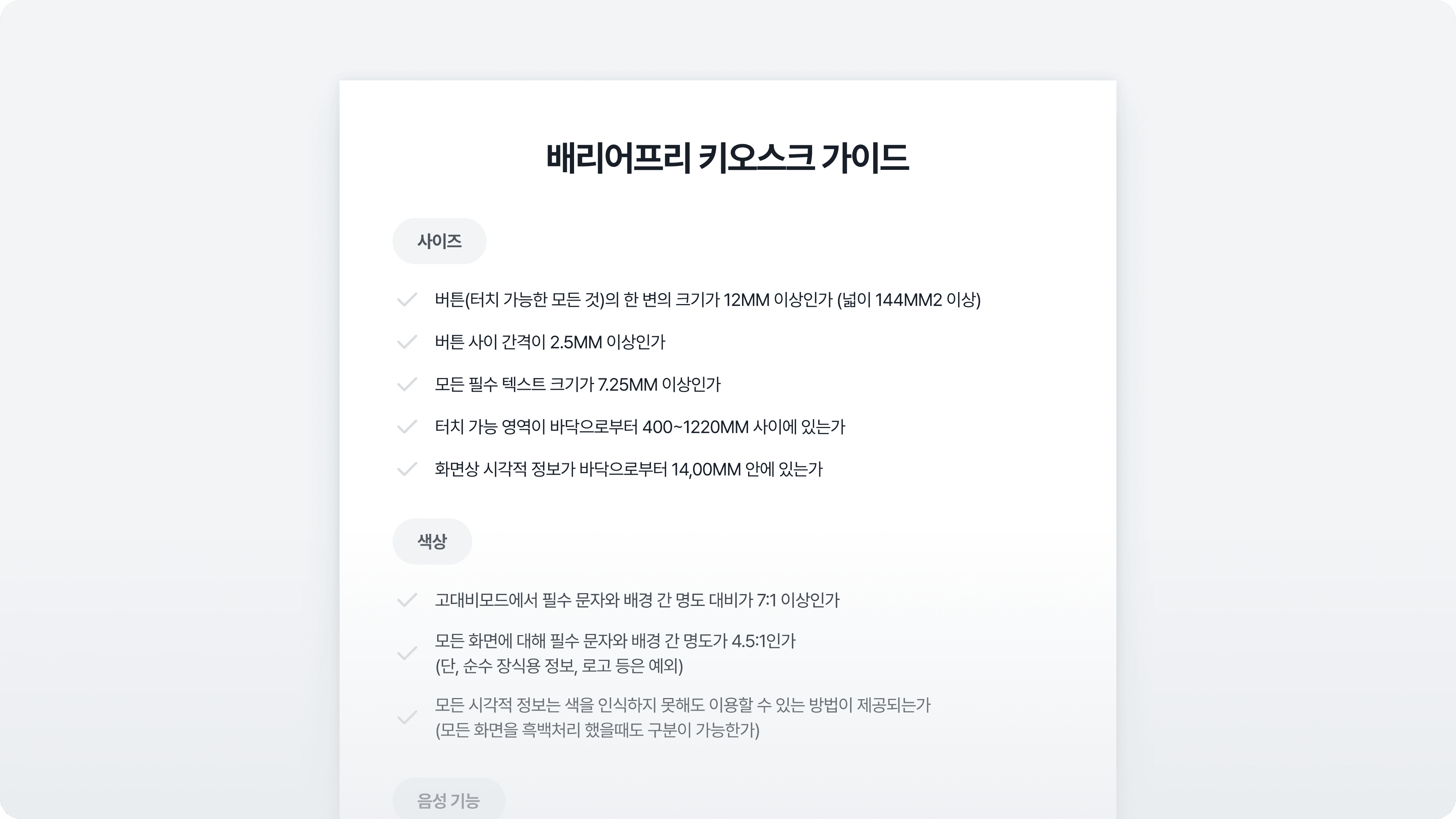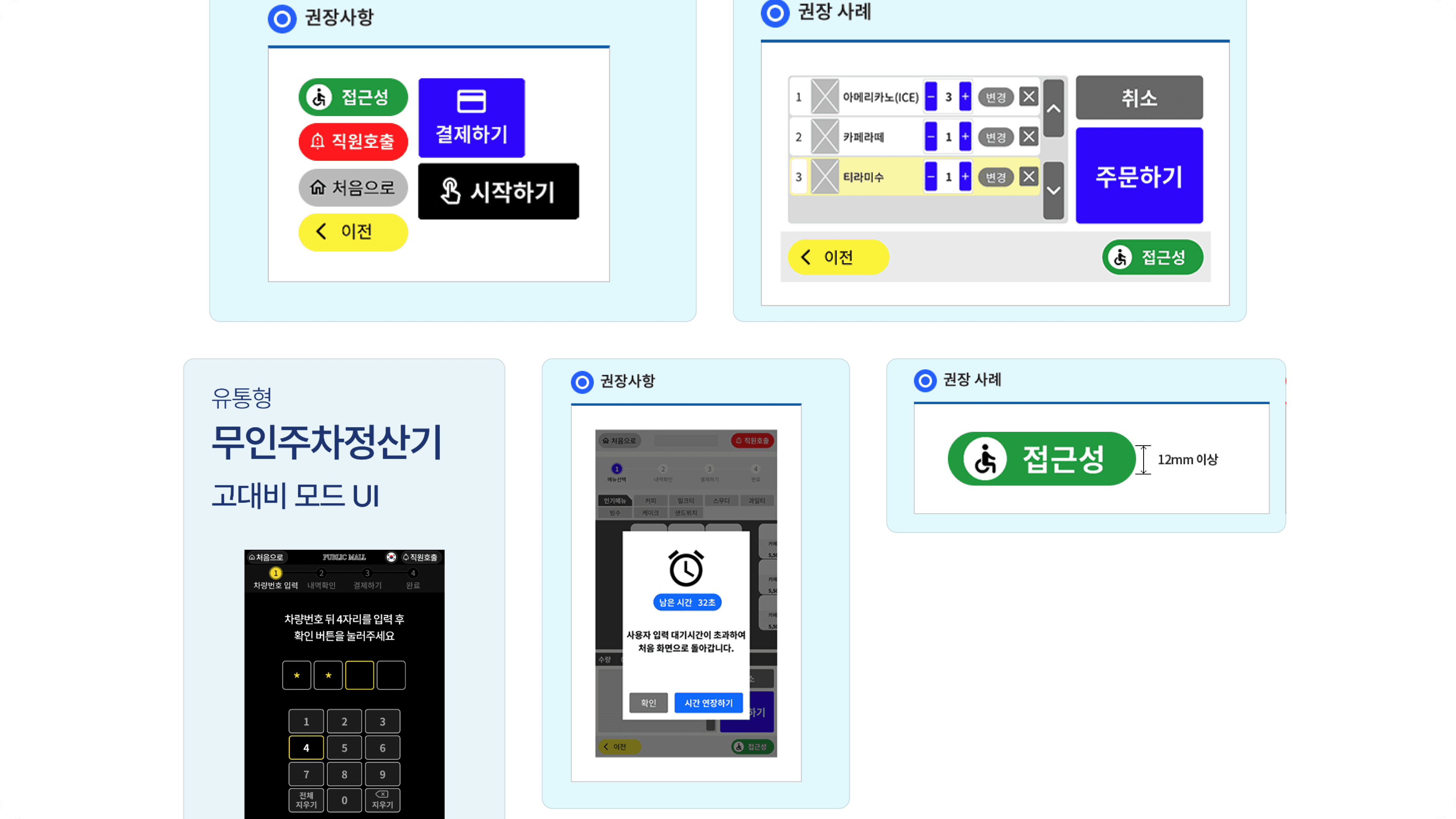 게다가 배리어프리 키오스크가 항상 모두에게 더 편한 UI는 아니에요. 기준을 충족하려면 화면 요소가 늘어나거나 안내가 추가되면서 흐름이 달라지고, 디자인 제약도 생길 수 있어요.
