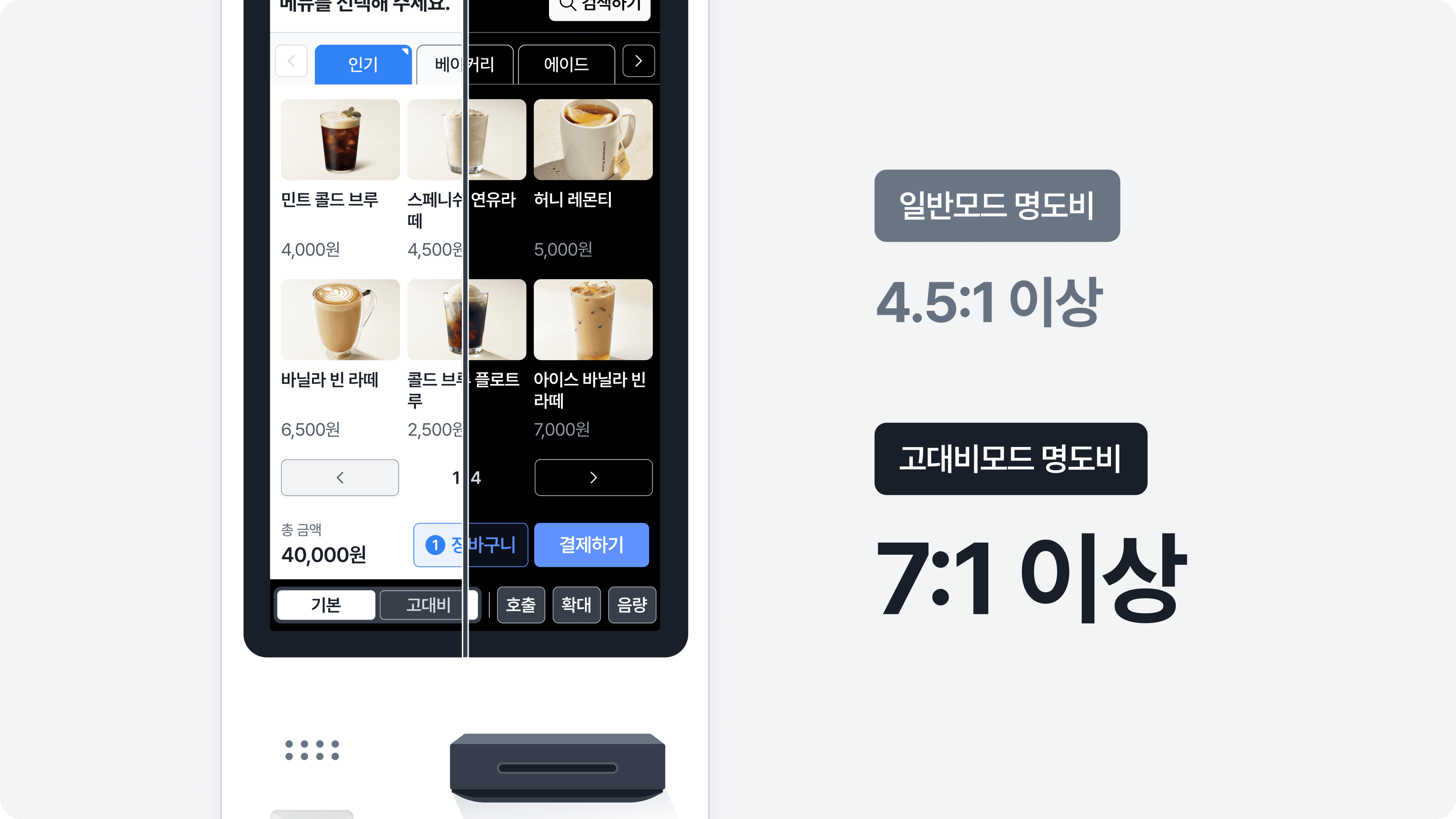 그래서 배리어프리 키오스크는 고대비 모드가 필수인데요. 일반 모드는 문자와 배경 간 명도 대비가 4.5:1 이상이면 되지만, 고대비 모드는 7:1 이상의 명도 대비를 갖춰야 해요.